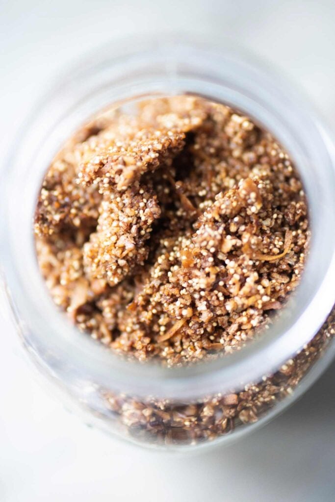 Store cooled granola in a mason jar or airtight container on the counter for up to a week.