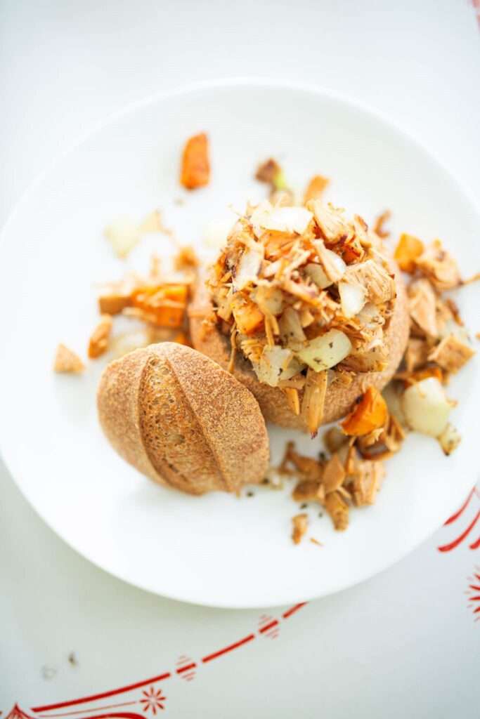 Fill with a creamy soup like my Butternut Squash Soup topped with parmesan and chopped bacon.